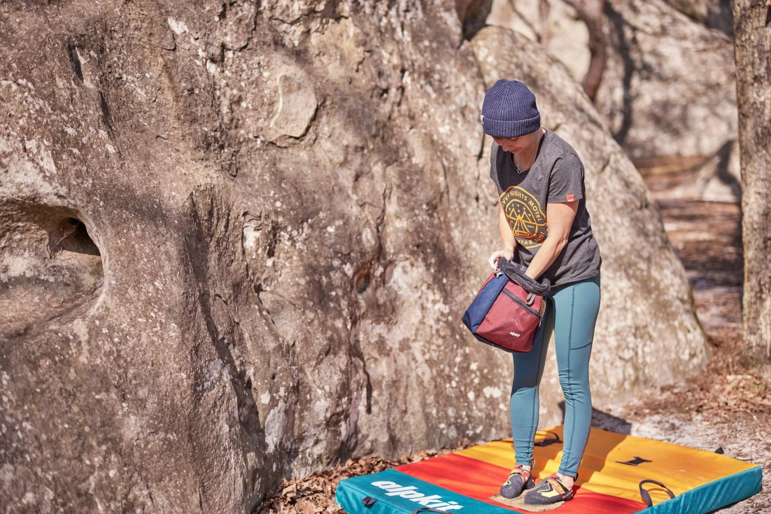 The boulder bucket is self-standing with a wide mouth that makes it easy for you to get to your chalk ready for the flash, with strong Velcro closure that stops your chalk from spilling out when you accidentally kick it over (again).