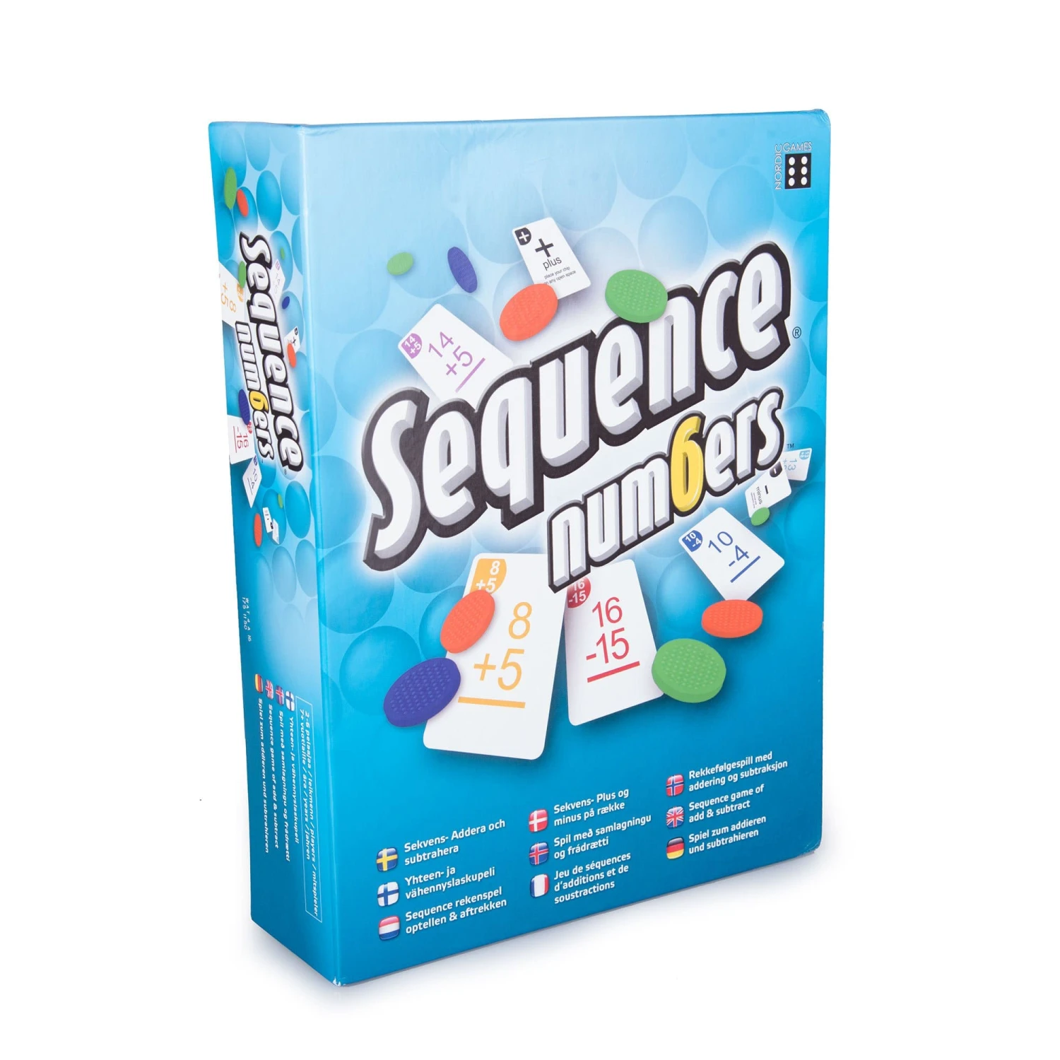 The cards have the equations… the gameboard has the answers. Each card has an additon or subtraction equation. Match a card to it’s correct answer on the board, then place your chip there. Groups of numbers are color-coded to help with number recognition. When you have 5 of your chips in a row, you’ve got a SEQUENCE !