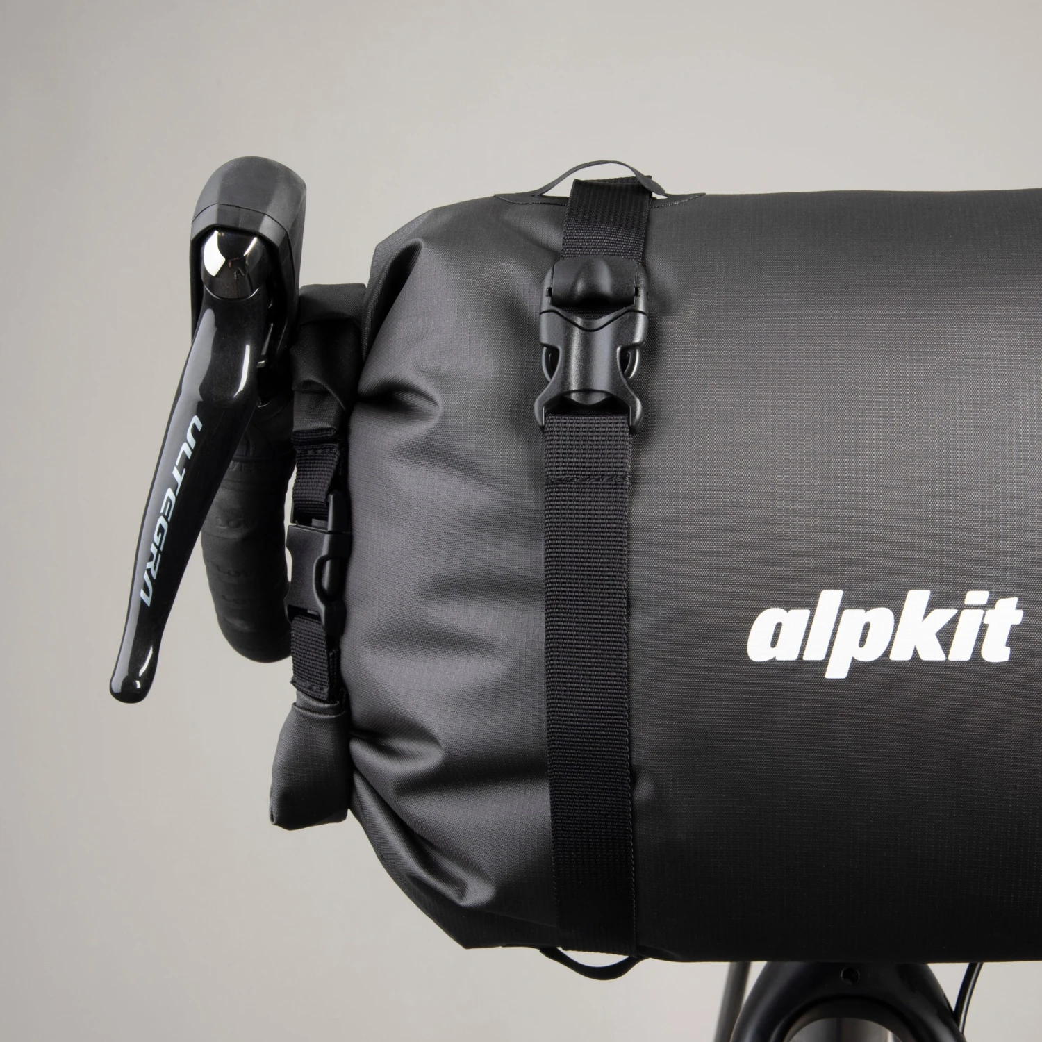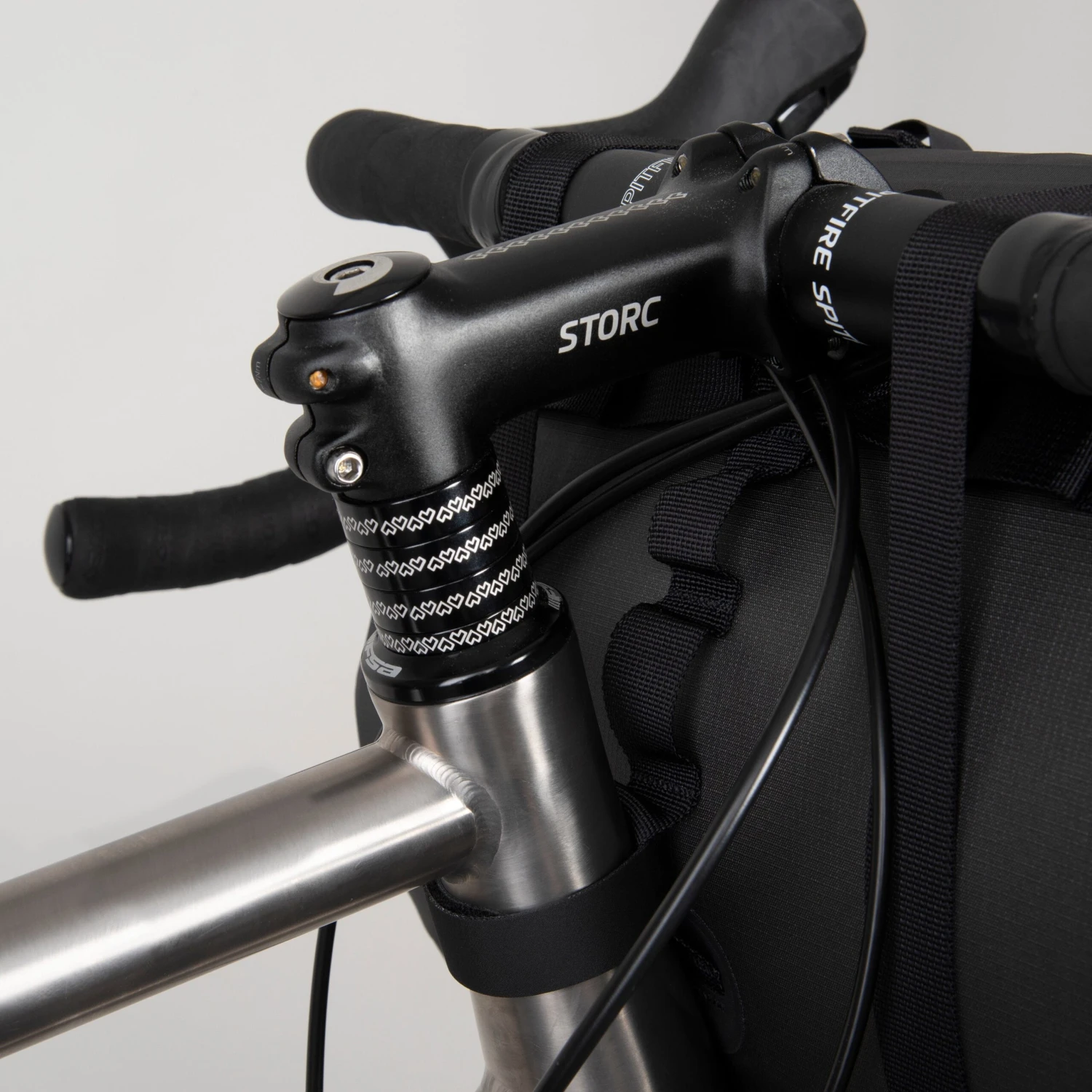 Fully waterproof seam-welded construction and roll top closure keeps your kit dry whatever the weather. Attaching securely to your bar and head tube with the integrated harness system and stiffener board, the 20L bag fits comfortably between wider drop bars.*