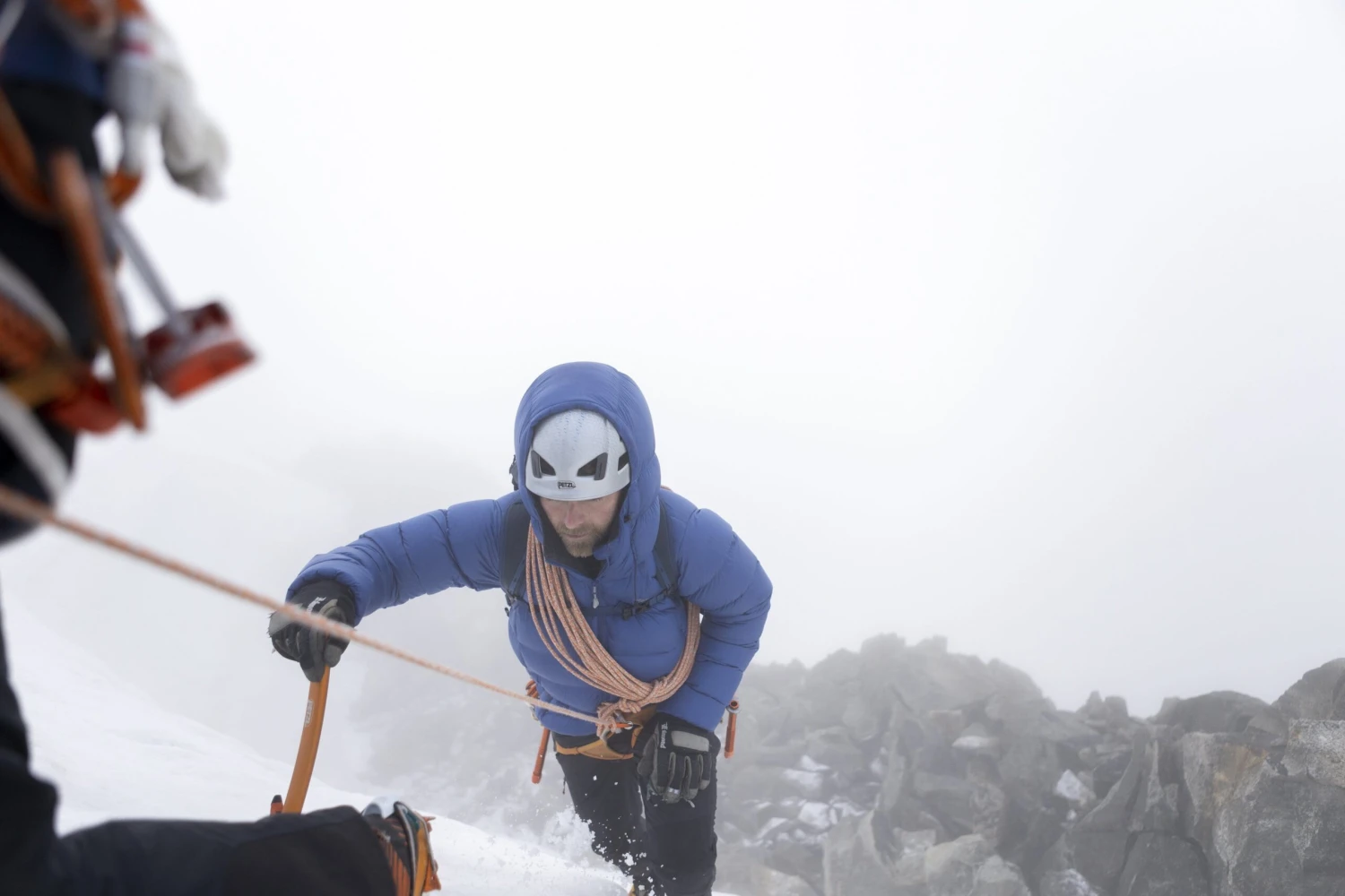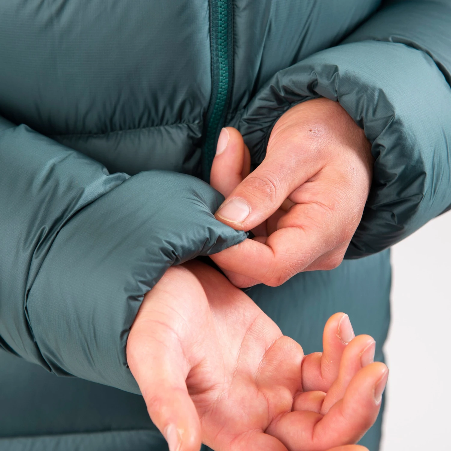 For climbing and mountaineering use, there’s a helmet-compatible hood with wired peak and a two-way front zip. The longer cut also stops your bum from getting chilly on long belays! The hood can be cinched right down with side and rear adjustors so that it keeps out draughts and follows your head movements.