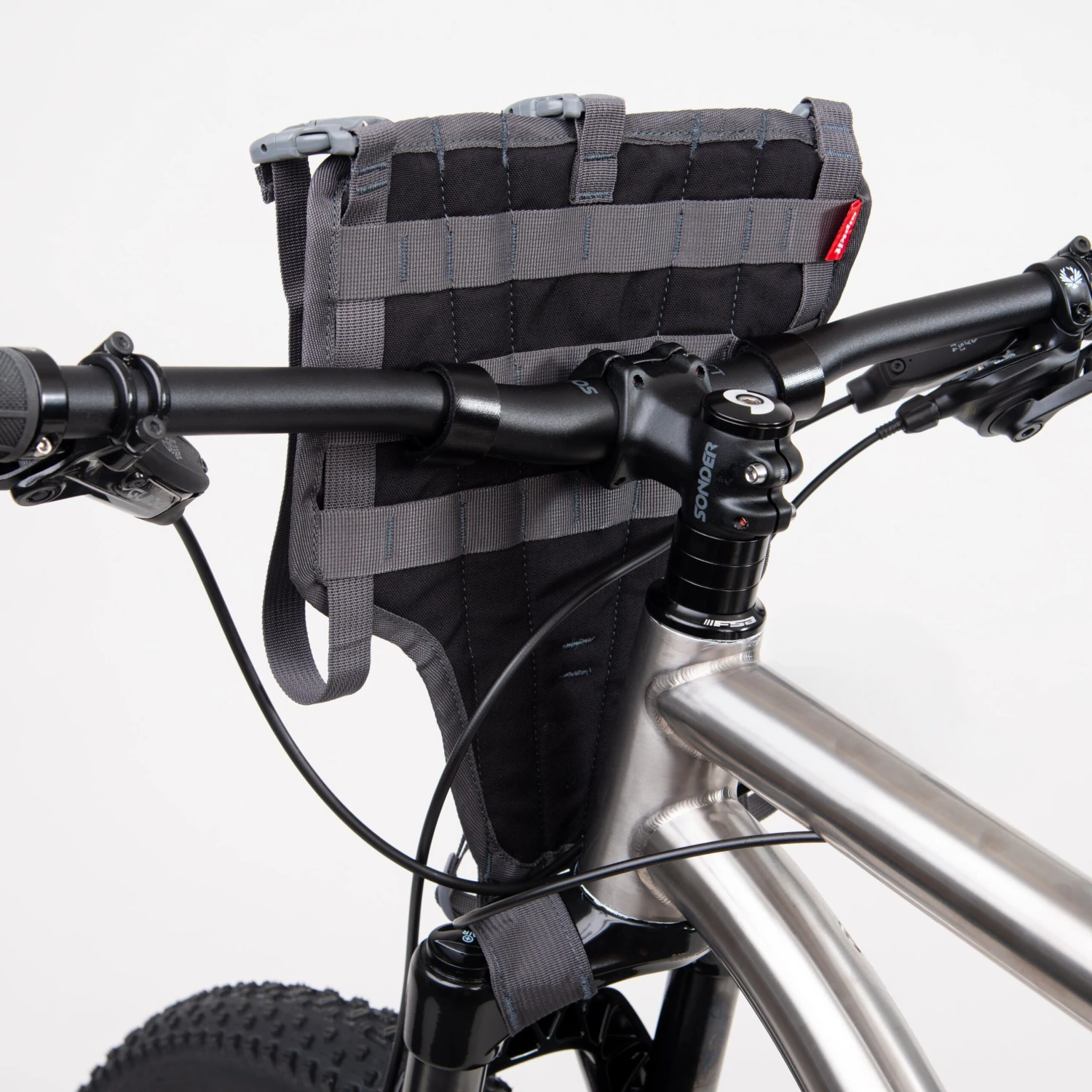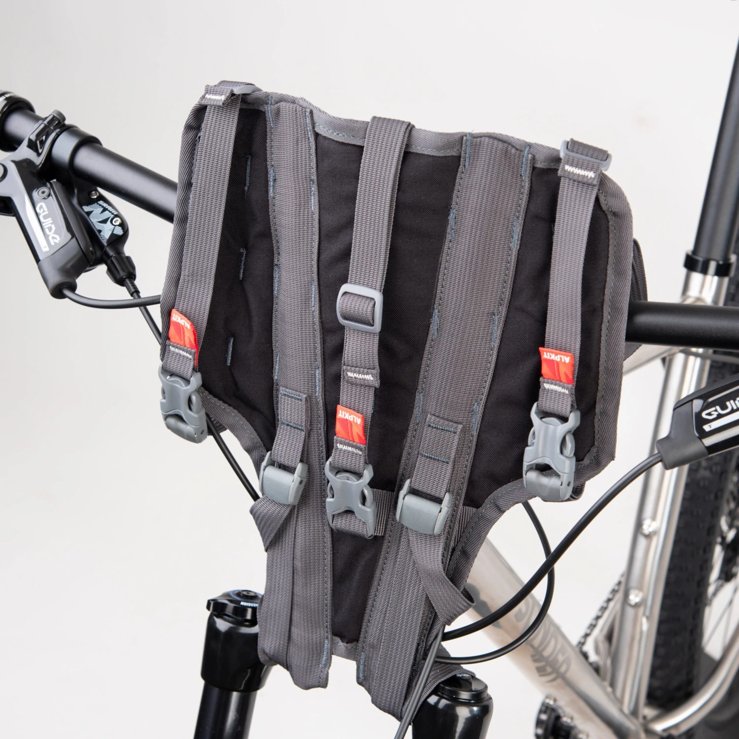 Originally designed with fat bikes in mind, Kanga is now for all bikes with flat or riser bars. Kanga is a handlebar harness to keep your handlebar bag stable and secure whilst increasing tyre clearance to prevent abrasions and wear.