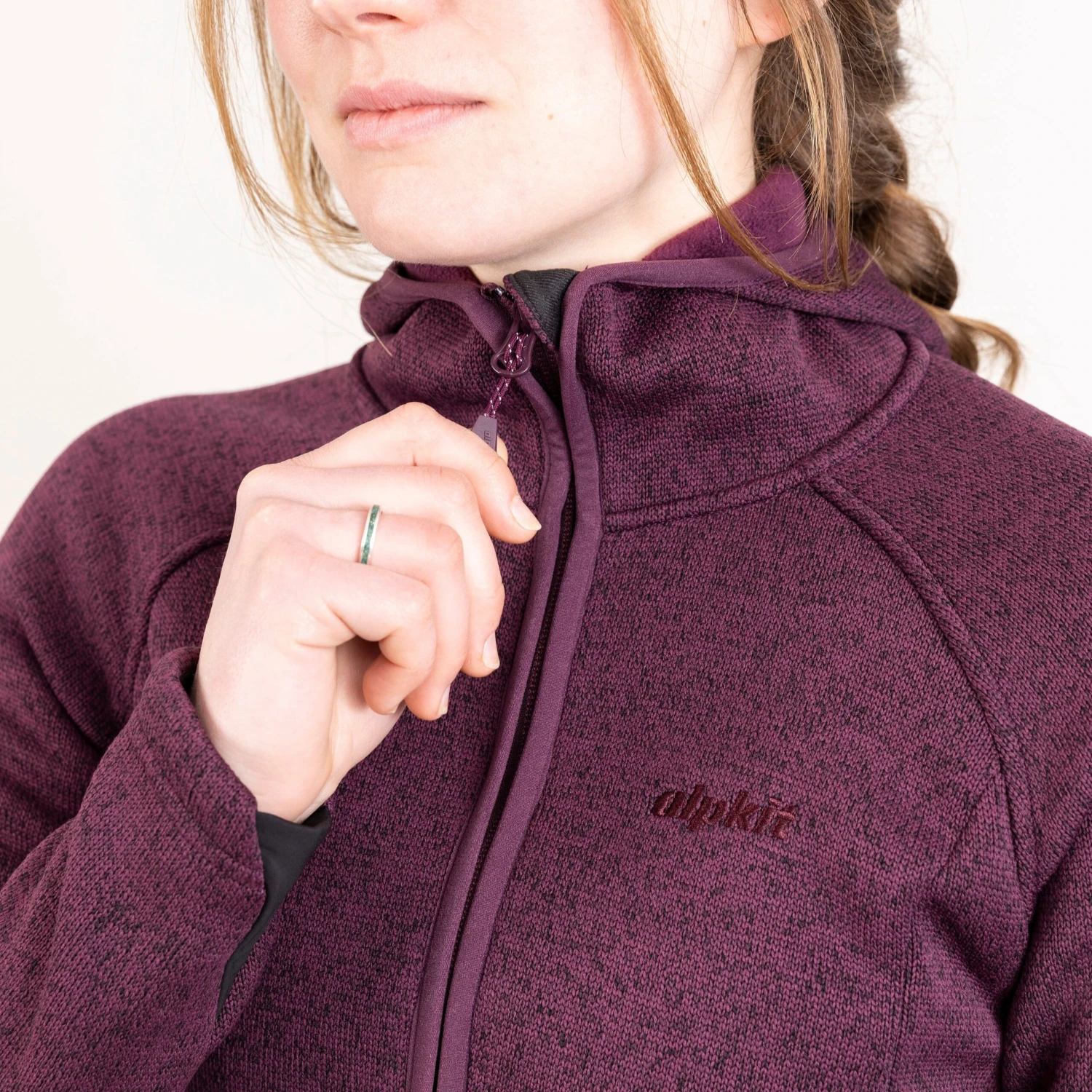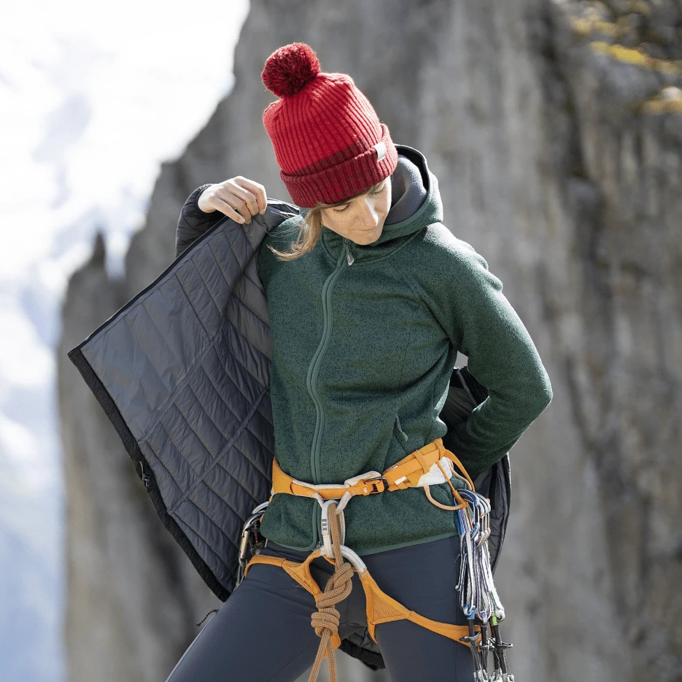 Less obviously ‘technical-looking’ with its knitted outer, the Mamalute has a comfy relaxed fit that leaves plenty of room to move. It’s equally at home knocking around the campsite as being thrown on at the bottom of the crag while you look through your guide. But that doesn’t come at the cost of technical features.