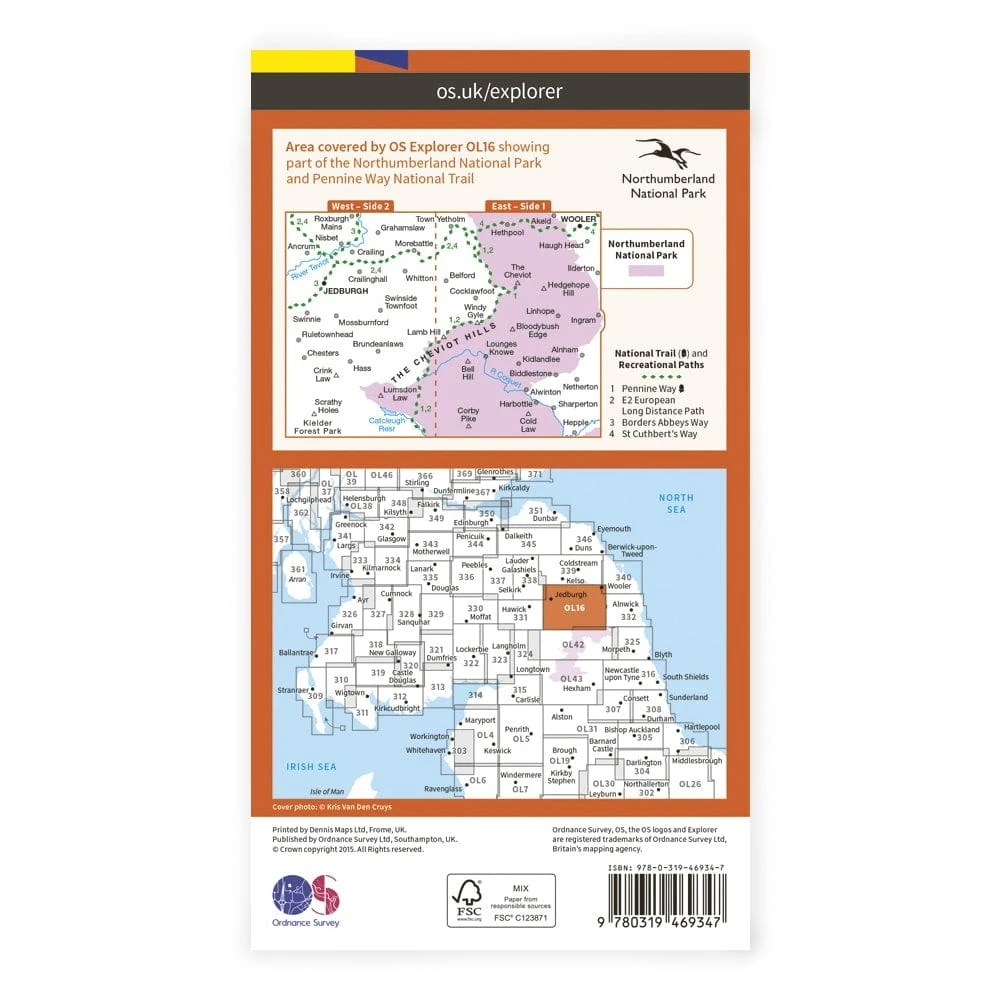 Explorer Active OL16 covers the Cheviot Hills, including Jedburgh, Wooler, the St Cuthbert’s Way and the Pennine Way.