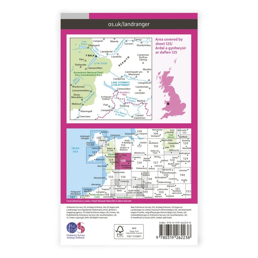 Landranger 125 covers west Gwynedd, south Denbighshire and north Powys, including the south-west corner of Snowdonia National Park, the Berwyn Hills and a section of the Glyndŵr’s Way National Trail.