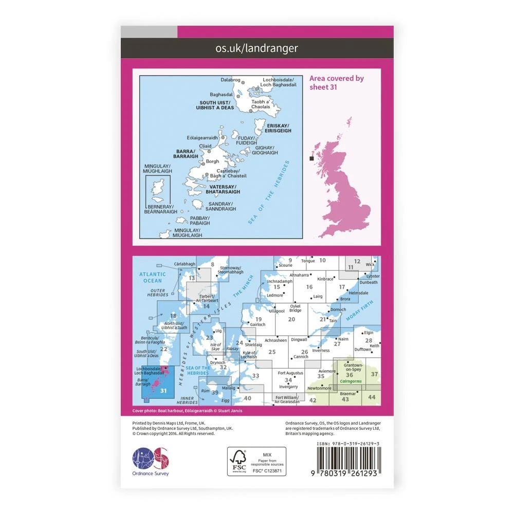Landranger 31 covers the southern section of the Outer Hebrides including Mingulay, Vatersay, Barra, Eriskay and South Uist – ideal for exploring the Hebridean Way.