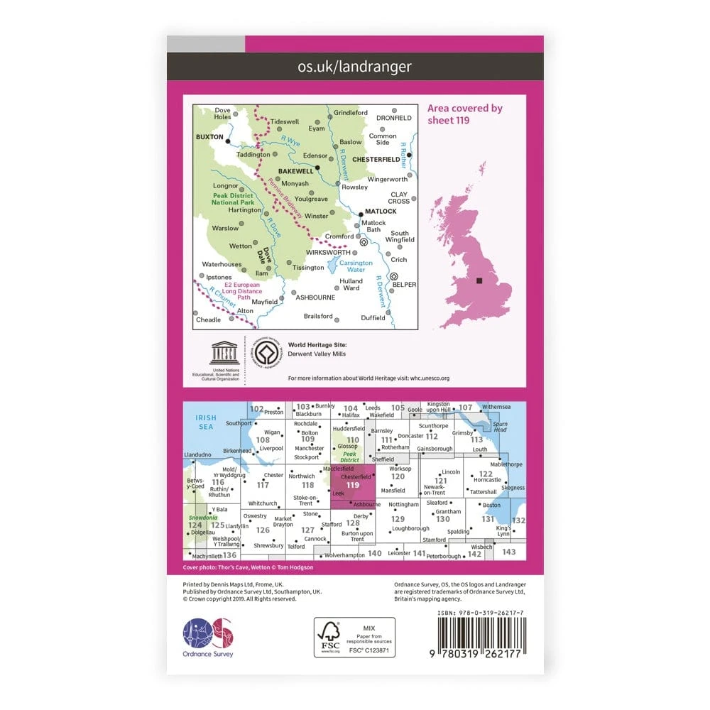 Landranger 119 covers Derbyshire and north Staffordshire, including the Derbyshire Dales and the White Peak area of the Peak District National Park.