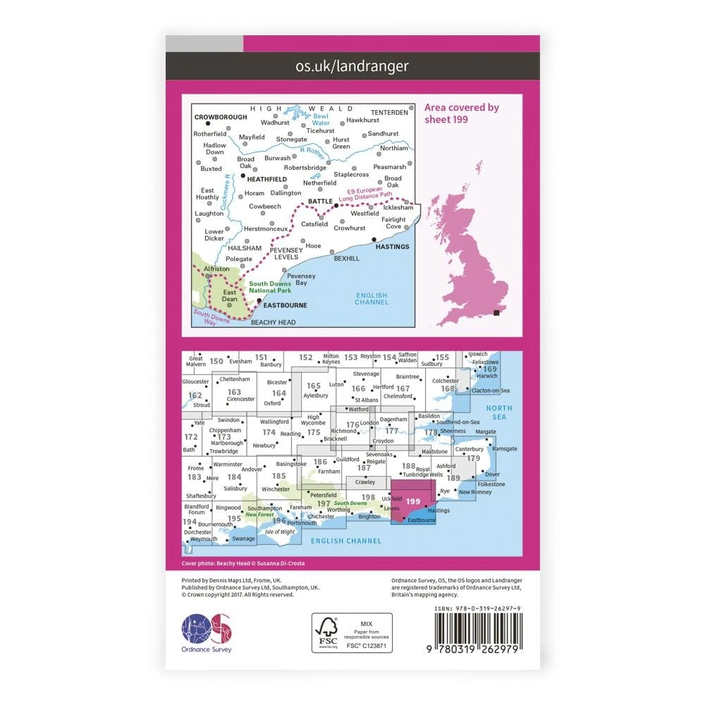 Landranger 199 covers East Sussex and the south coast, including the eastern edge of the South Downs Way long distance footpath.