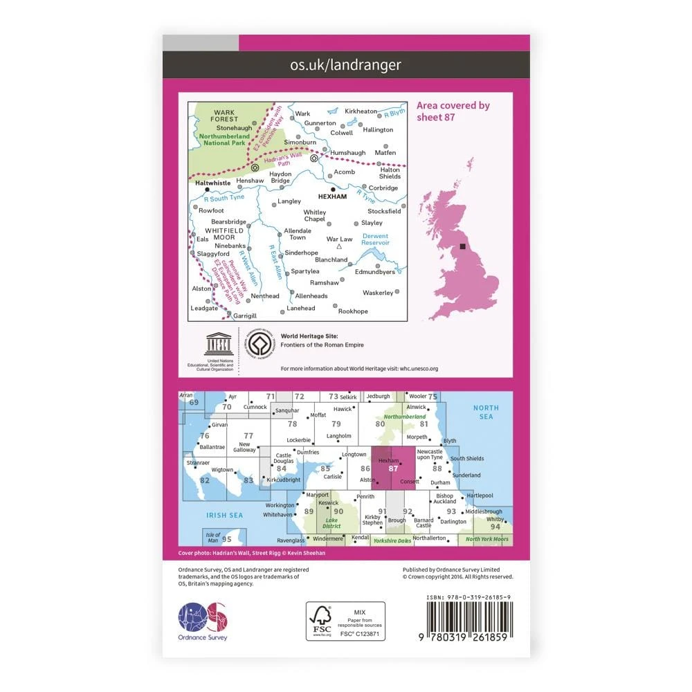 Landranger 87 covers south-west Northumberland and the North Pennines, including part of the Hadrian’s Wall Path and Pennine Way national trails.