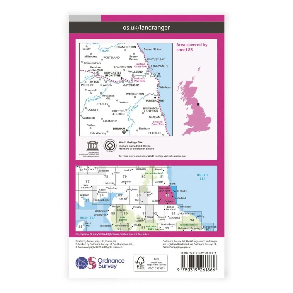 Landranger 88 covers Tyneside, Wearside and County Durham, including the start/finish of the Hadrian’s Wall Path long distance trail.