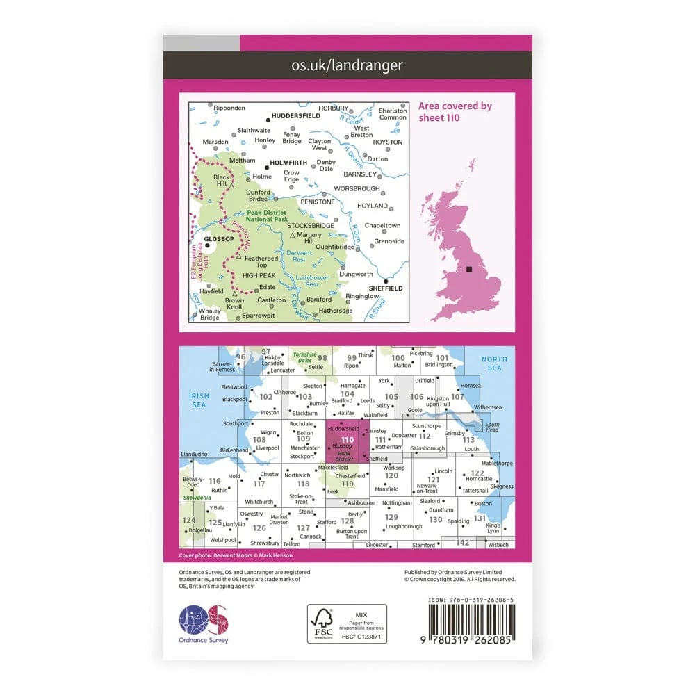 Landranger 110 covers western South Yorkshire and north Derbyshire including the Dark Peak half of the Peak District National Park and the start/finish of the Pennine Way.