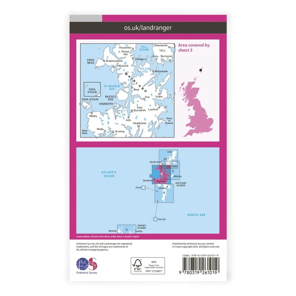 Landranger 3 covers the central section of the Shetland Isles and the northern half of Mainland up to Yell Sound.