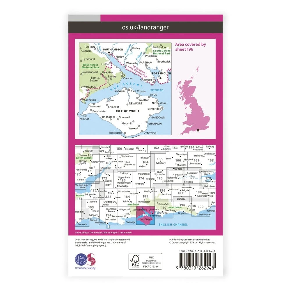 Landranger 196 covers the whole of the Isle of Wight, the south coast from Portsmouth to Keyhaven (including a section of the South West Coastal Path) and New Forest National Park.
