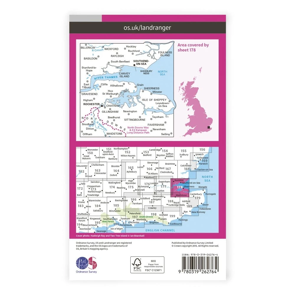Landranger 178 covers south-east Essex and north-east Kent either side of the Thames Estuary, including part of the North Downs Way and Kent Downs AONB.