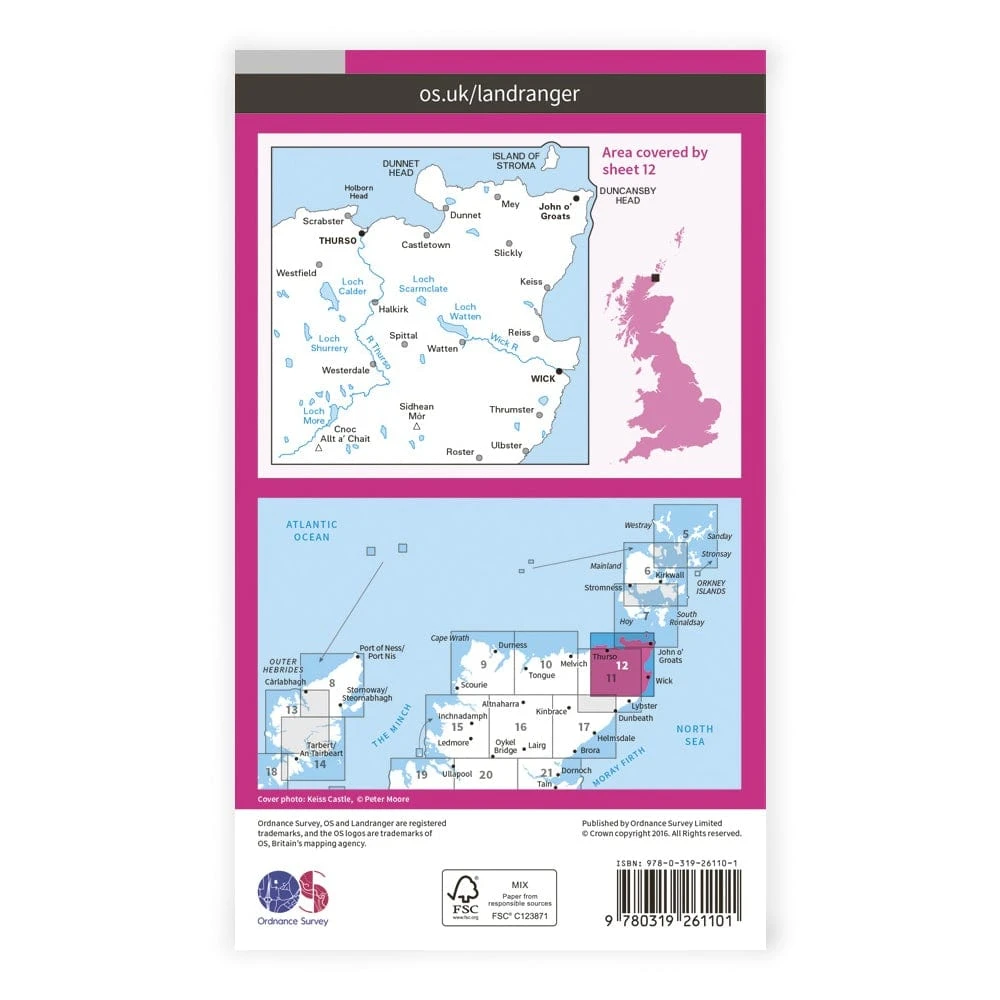 Landranger 12 covers the coast around the north-east tip of Scotland including Dunnet Head and John o’ Groats – the most northerly and most north-eastern tip of Scotland and mainland Great Britain.