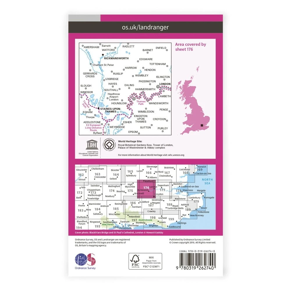Landranger 176 covers West London from Enfield and Croydon as far as Windsor and Slough, including the Thames Path.