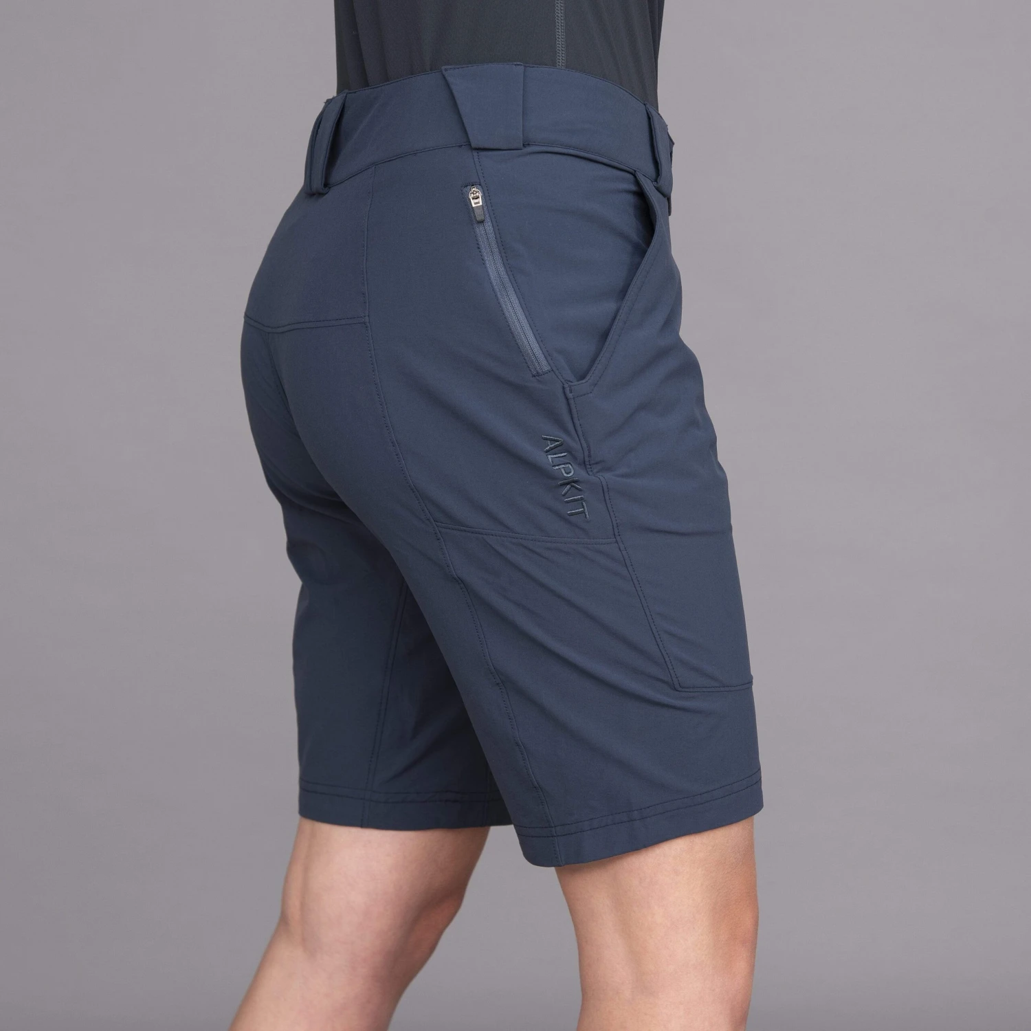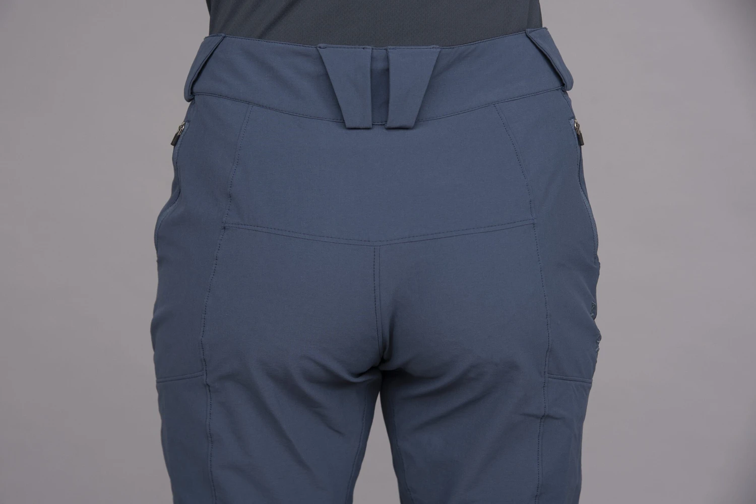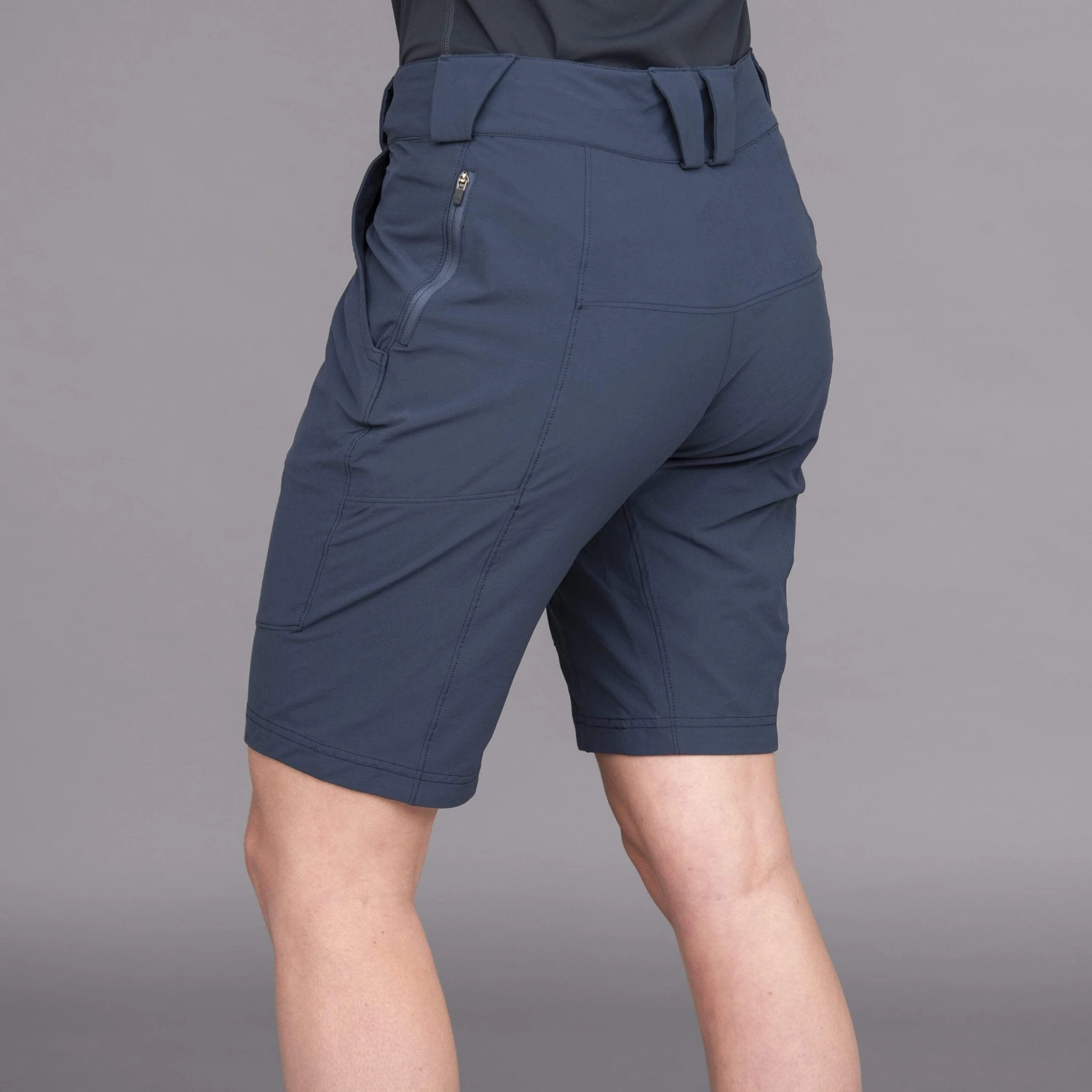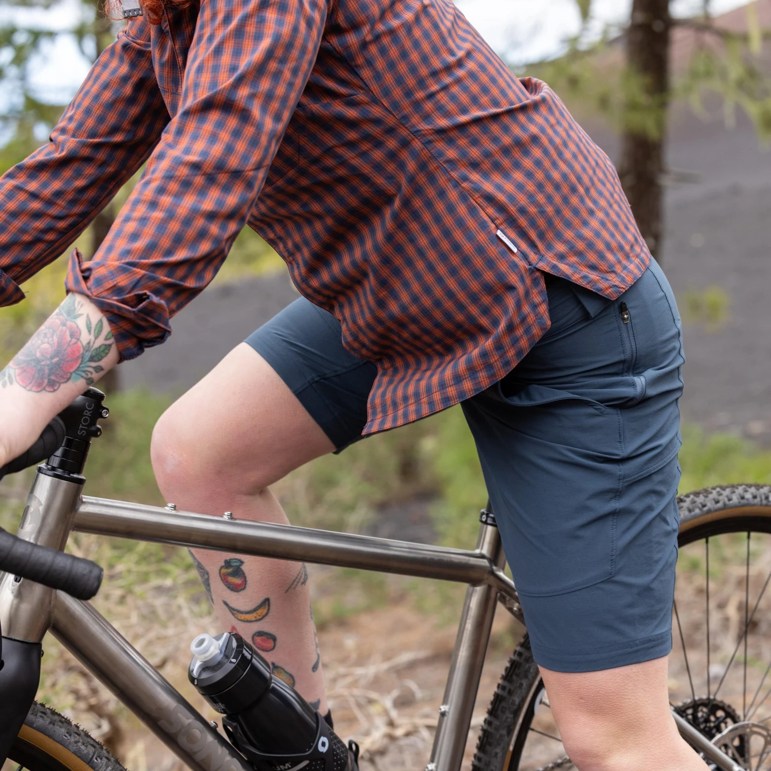 Strada performance fabric is light and breathable, with four-way stretch and a tailored cut. The shorts are articulated for your position on the bike, with a high back and no-stretch waist so they don’t ride down. The legs are cut to be well-fitting yet unrestrictive over your thighs and sit just above the knee, leaving room for knee pads and layering comfortably over undershorts if you need them. They feature deep front pockets and zipped hip pockets that sit out of the way when you’re riding.