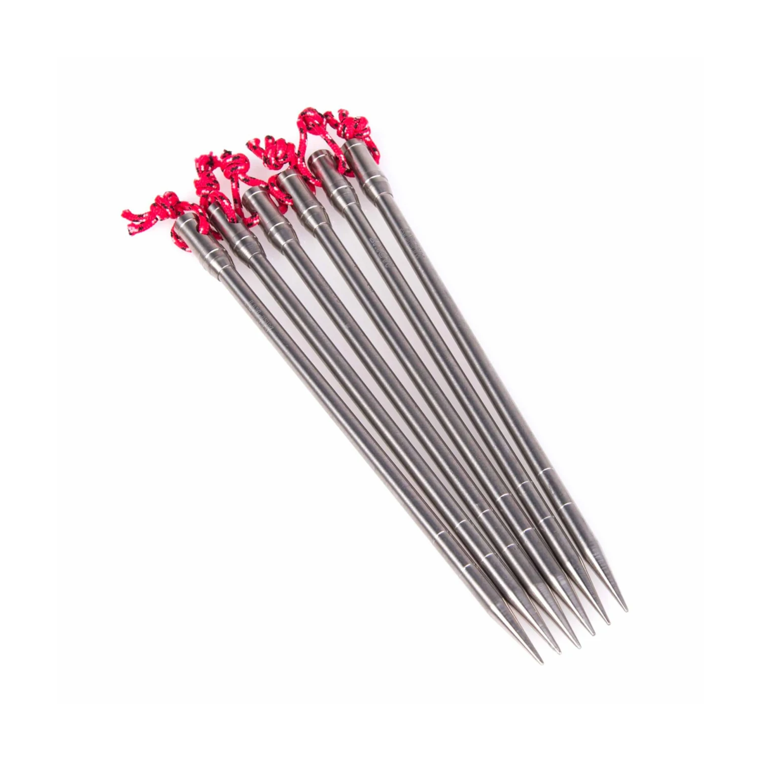 Slimline, packable titanium tent pegs that you can actually take into the mountains and bring home. Lightweight but no so ridiculously thin they are gonna bend when you look at them.