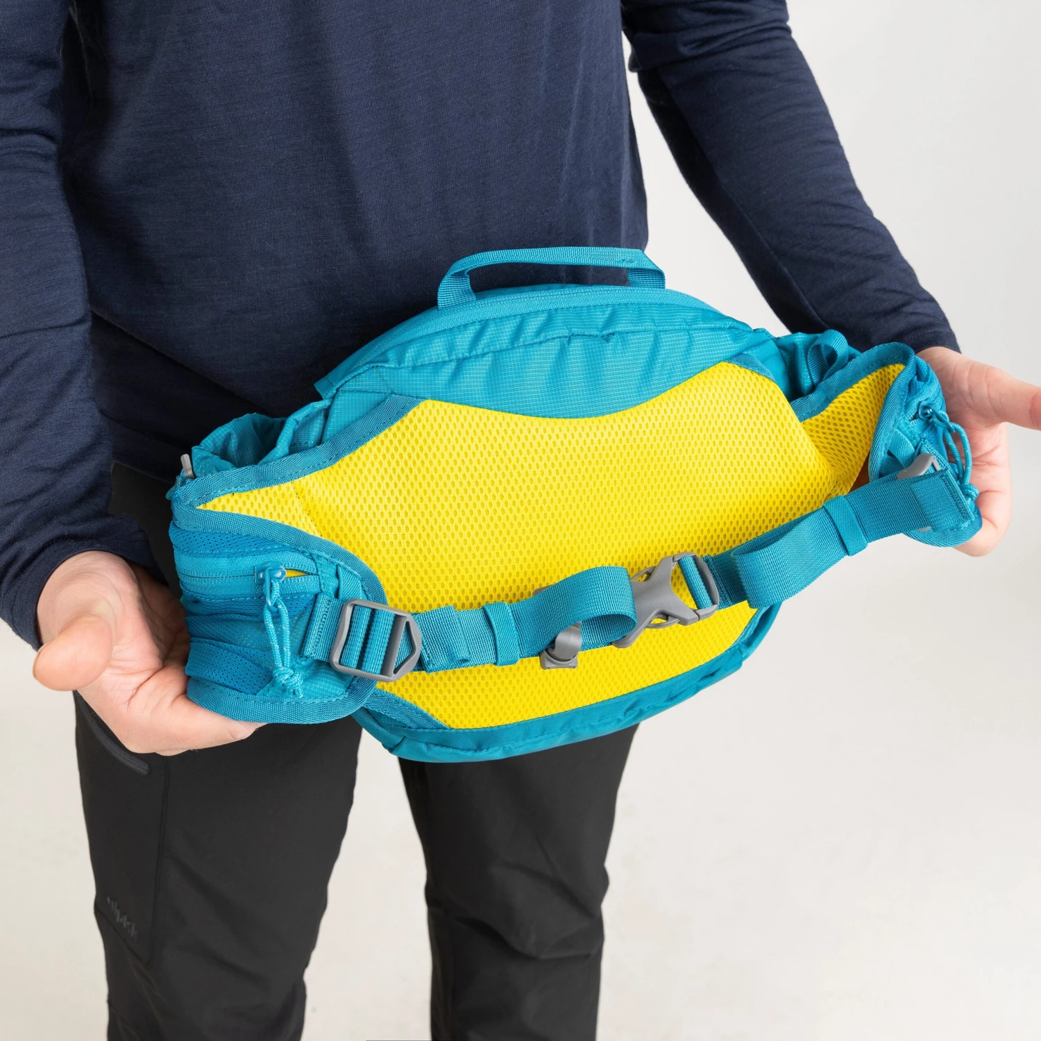 It sits around your waist with a secure waistbelt to reduce movement on the trails. Well-vented mesh padding gives excellent airflow to keep you cool.